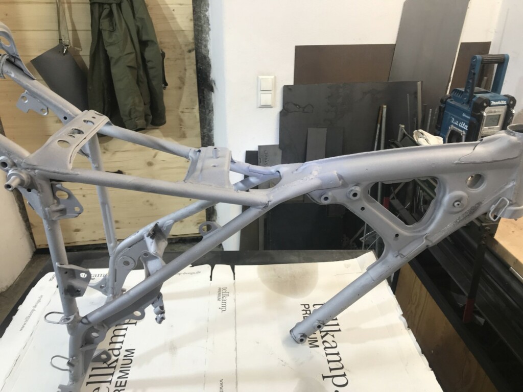 Der Tank im wunderschönen Originalfarbton „Magnum Silver Metallic“ war noch in einem sehr guten Originalzustand und sollte so auch erhalten werden. Der Kotflügel war stark zerkratzt, die Seitendeckel deto. Originale Dekorsätze für einen Seitendeckel und Frontmaske konnten noch aufgetrieben werden, die rote Linierung wurde originalgetreu nachgearbeitet.