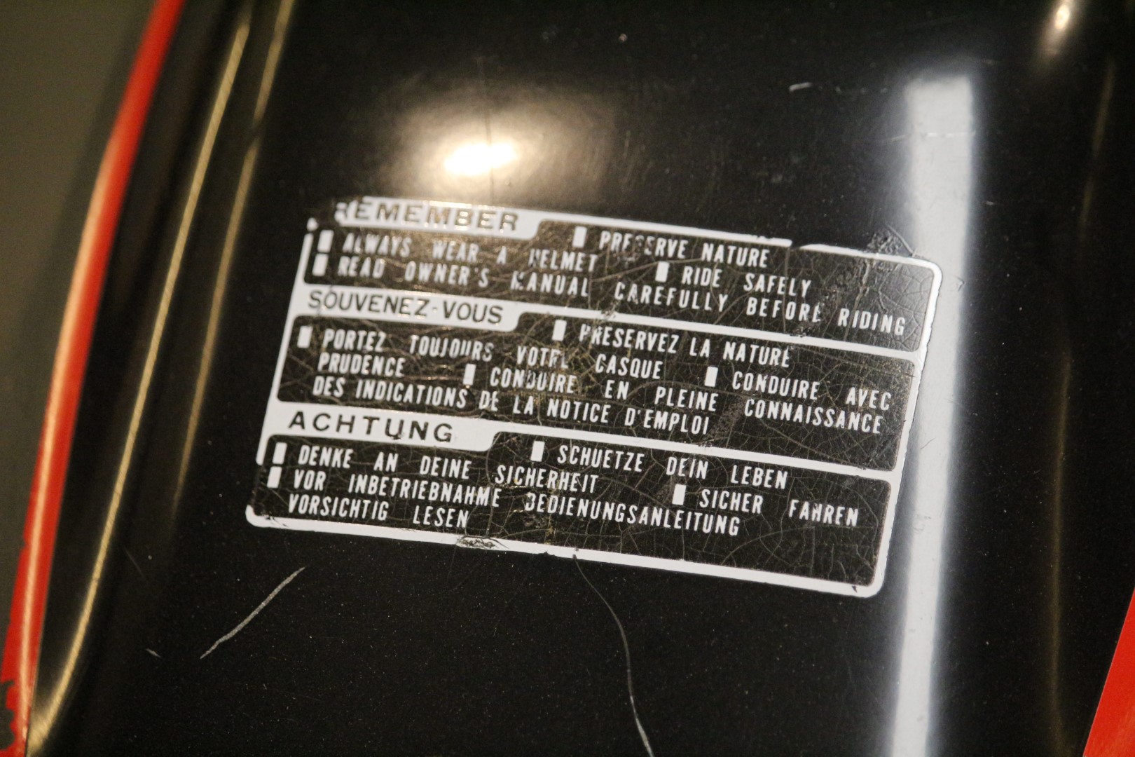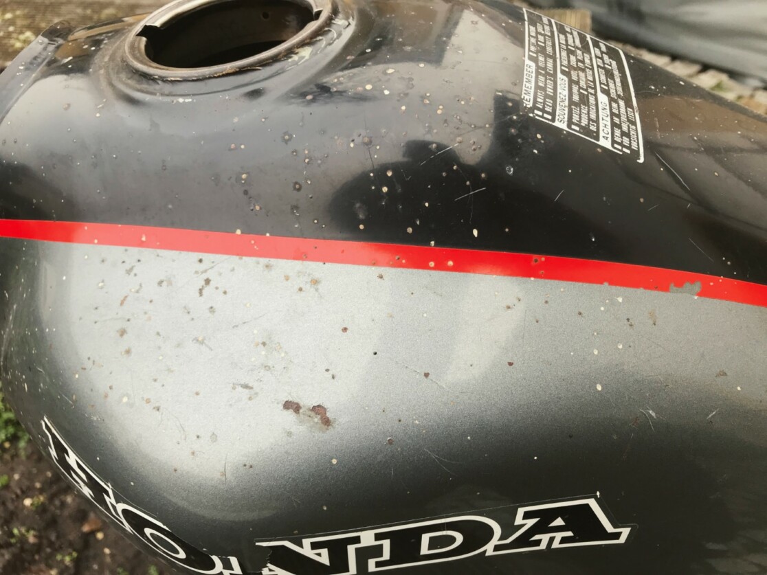 Der Tank im wunderschönen Originalfarbton „Magnum Silver Metallic“ war noch in einem sehr guten Originalzustand und sollte so auch erhalten werden. Der Kotflügel war stark zerkratzt, die Seitendeckel deto. Originale Dekorsätze für einen Seitendeckel und Frontmaske konnten noch aufgetrieben werden, die rote Linierung wurde originalgetreu nachgearbeitet.