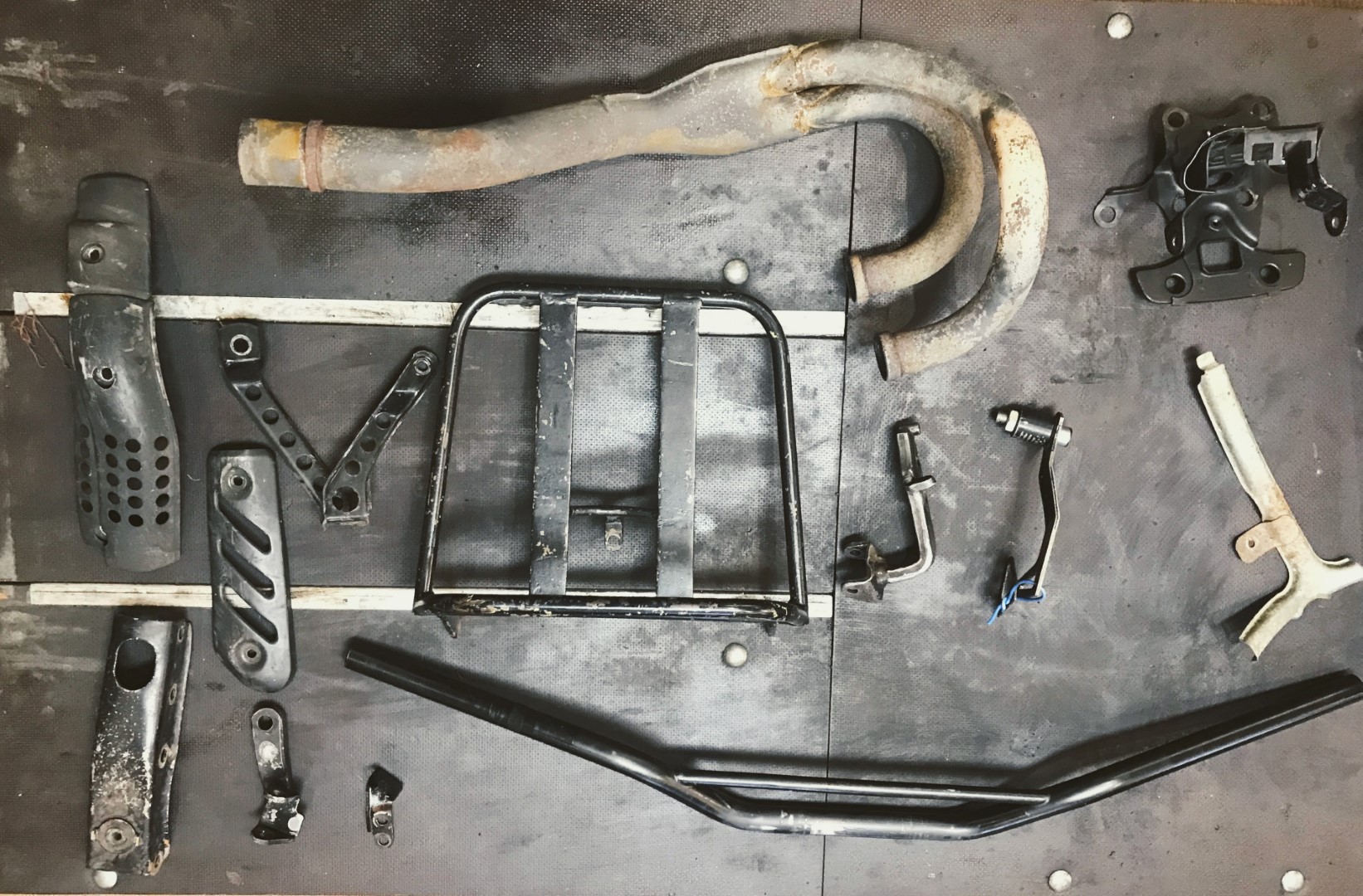 Für eine Restauration sind natürlich Originalteile unabdinglich. Zum Glück waren nahezu alle Anbauteile, wie Scheinwerfer, Verkleidungsteile, Blinker, Rücklicht, etc. noch erhalten, zwar stark verschmutzt, aber noch mit von der Partie.