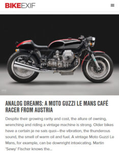 Ich bin stolz auf die bisherigen Erscheinungen in Print- und Digitalmedien und bedanke mich bei den Redakteuren für die ehrlichen Worte. Sollten Sie interessiert an einem gemeinsamen Beitrag oder einer Veröffentlichung über eines meiner Motorräder/Projekte sein, kontaktieren Sie mich gerne. Ich freue mich!